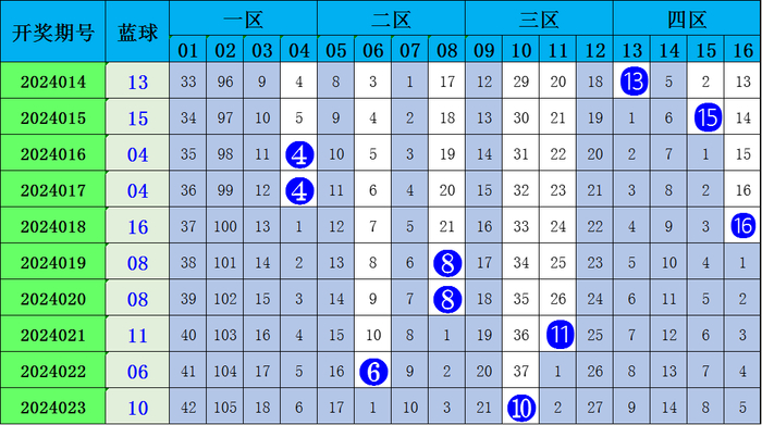 蓝球走势分析:上期蓝球出号10,为大偶数,近10期蓝球抽象奇偶比3:7,奇数出号频率较冷,要点温存:小奇数号码05。